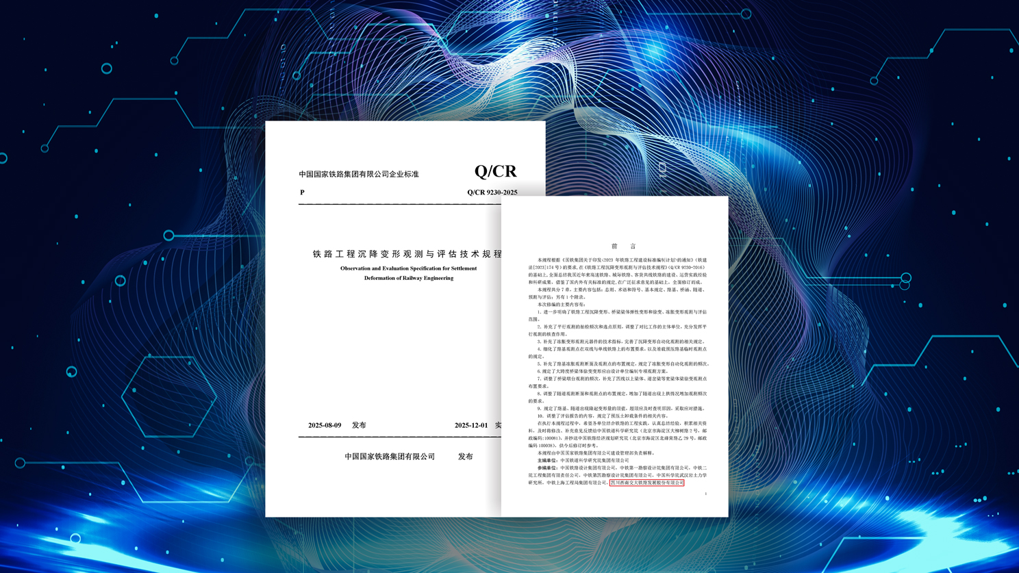 公司参与编制的又一项企业标准正式发布实施 [2025-12-02]2025年12月1日,Bwin必赢网站入口参与编制的中国国家铁路集团有限公司企业标准《铁路工程沉降变形观测与评估技术规程》(Q/CR 9230—2025)获准发布并实施。 该规程适用于新建和改建铁路工程沉降变形的观测与评估,对统一铁路工程建设期间沉降变形观测与…