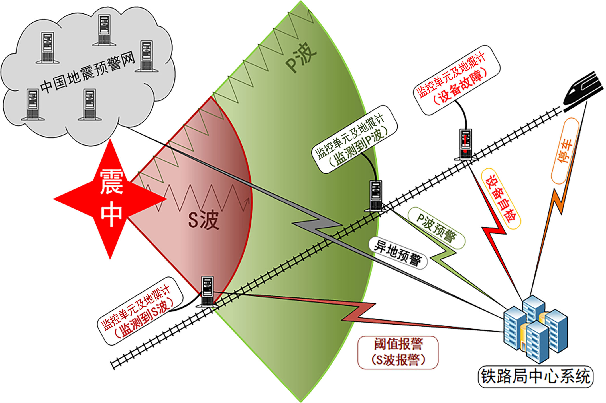 地震预警系统是利用P波和S波速度差,抢在破坏性地震S波到达之前,发出预警信息。在地震发生时,监控单元实时计算单台预警信息,传输至前端预警服务器,运用区域预警算法,生成多台预警信息,计算紧急处置范围并发送至牵引供电系统、列控系统和车载装置,实现列车紧急制动。