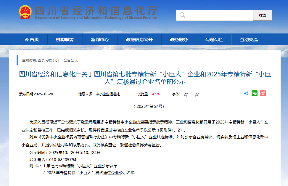 近日,四川省经济和信息化厅公布《四川省经济和信息化厅关于四川省第七批专精特新“小巨人”企业和2025年专精特新“小巨人”复核通过企业名单的公示》,公司通过2025年专精特新“小巨人”企业的复核。